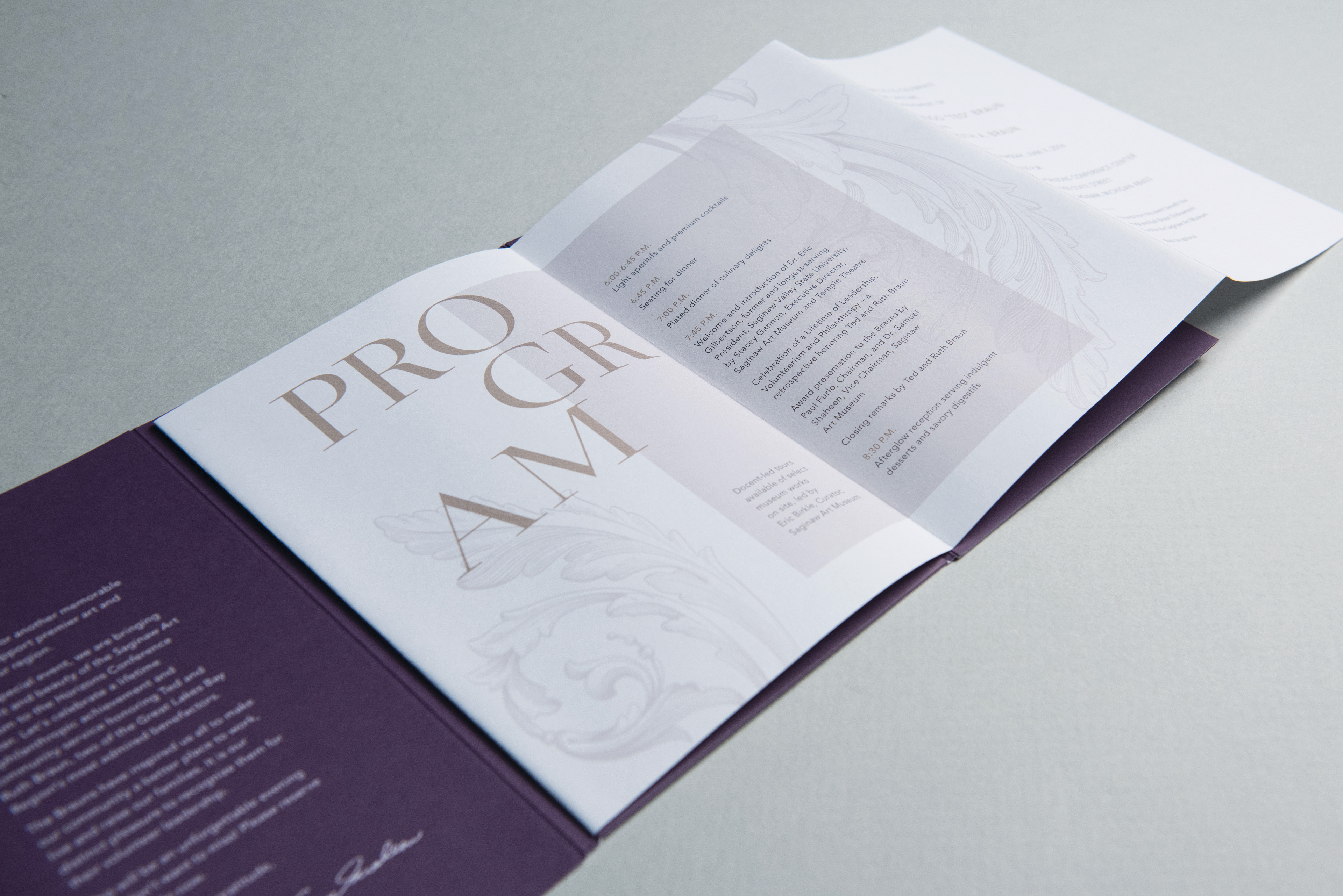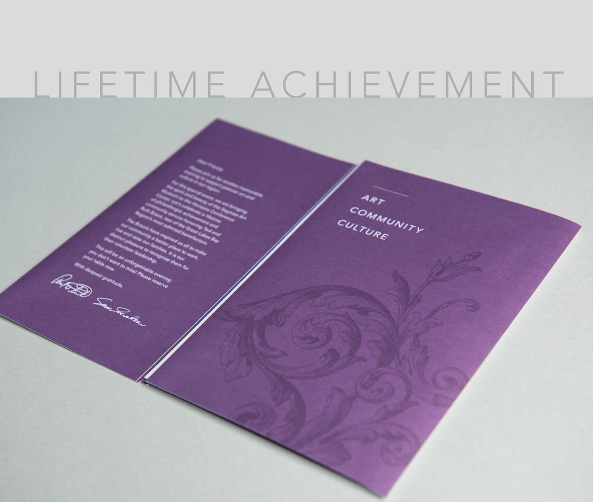 The Saginaw Art Museum hosted an event to honor the lifetime achievement of a prominent Saginaw couple while celebrating art, community and culture. The award winning design of this invitation combined traditional elements with modern layout. Pearl foils and metallic inks applied to uncoated stock created a premier look for this exclusive event.