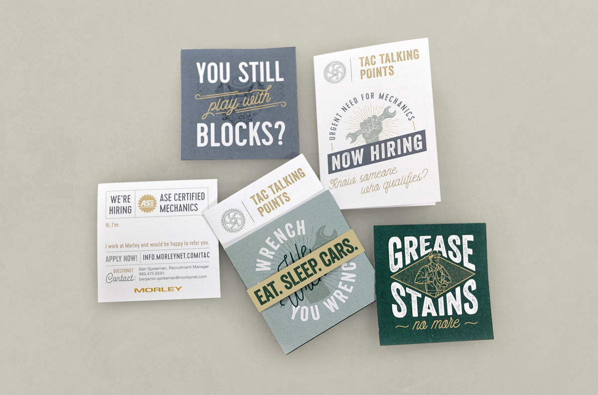 The campaign’s goal was to identify and hire automotive experts to fill open positions in Morley’s Technical Assistance Center (TAC). The challenge is the auto tech audience is not familiar with Morley as a potential employer needing their skill set. To capture their attention, we developed an integrated campaign showing provocative headlines set in a neo-vintage style that incorporates a masculine color palette and grit texture. Externally, this campaign included direct mail, email marketing, social media advertising, video, feather-flag banners, referral cards and giveaways. We maintained campaign enthusiasm internally by distributing t-shirts and hanging posters advertising a referral bonus. My role included concept development, design direction and graphic design.